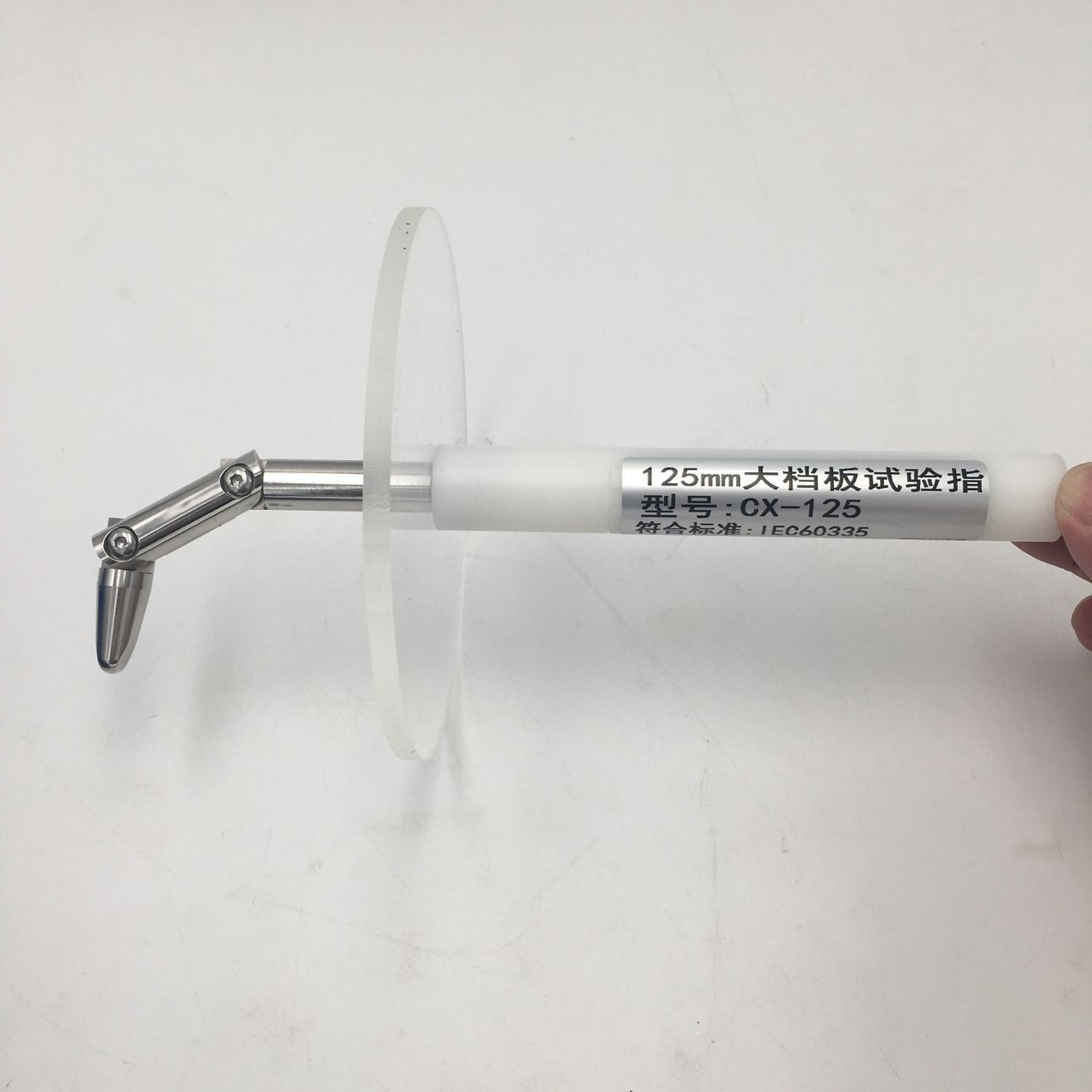 檔板直徑125mm標(biāo)準(zhǔn)試驗(yàn)指采用類似IEC61032的B型試驗(yàn)探棒,擋板則采用直徑為125mm的圓擋板取代非圓形擋板,從試驗(yàn)指尖端到擋板的距離為100mm
