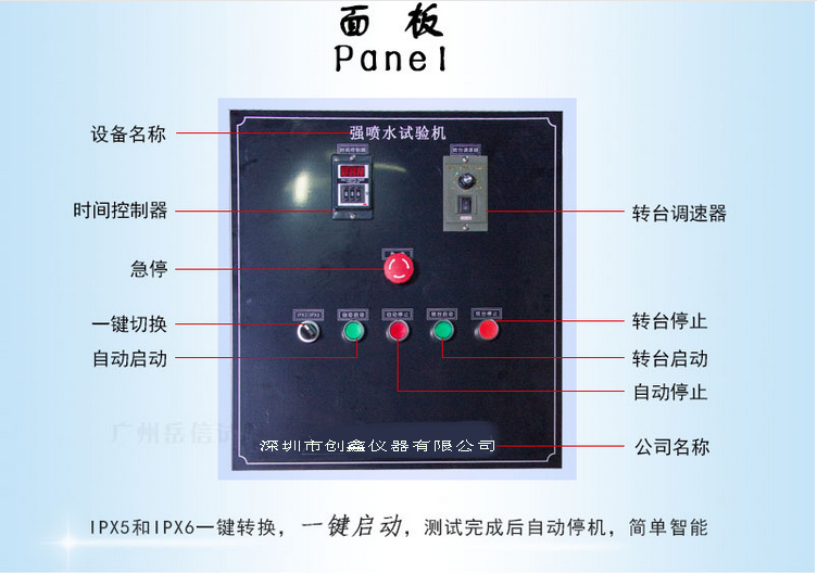 4、測試時間可設(shè)定0-999M可調(diào),樣品電源帶通電時間控制功能,IPX5和IPX6測試一鍵轉(zhuǎn)換,一鍵啟動,自動停機,簡單智能。